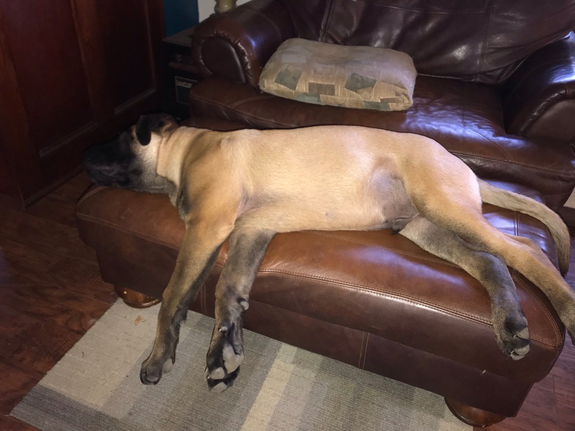 We have also come to the conclusion that mastiff puppy energy levels match our aging energy levels pretty well. Play hard for ten minutes…rest…rest some more….eat….rest a bit ….play a little…yawn…..eat….nap….mosey…snack….doze….make someone smile…sleep…dream…wake up…repeat.